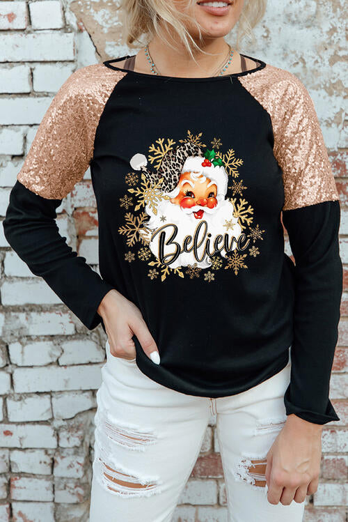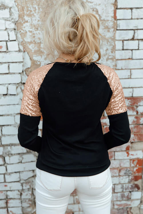 BELIEVE Sequin Long Sleeve Round Neck Blouse