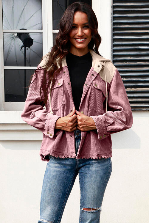 Contrast Drawstring Snap Down Raw Hem Hooded Jacket