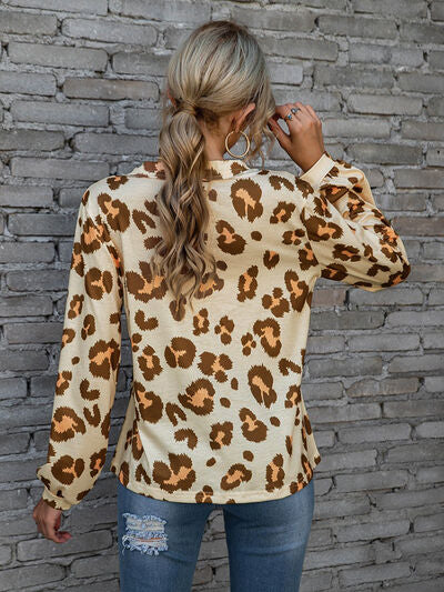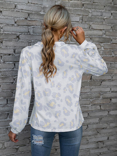 Leopard V-Neck Decorative Button Long Sleeve Blouse
