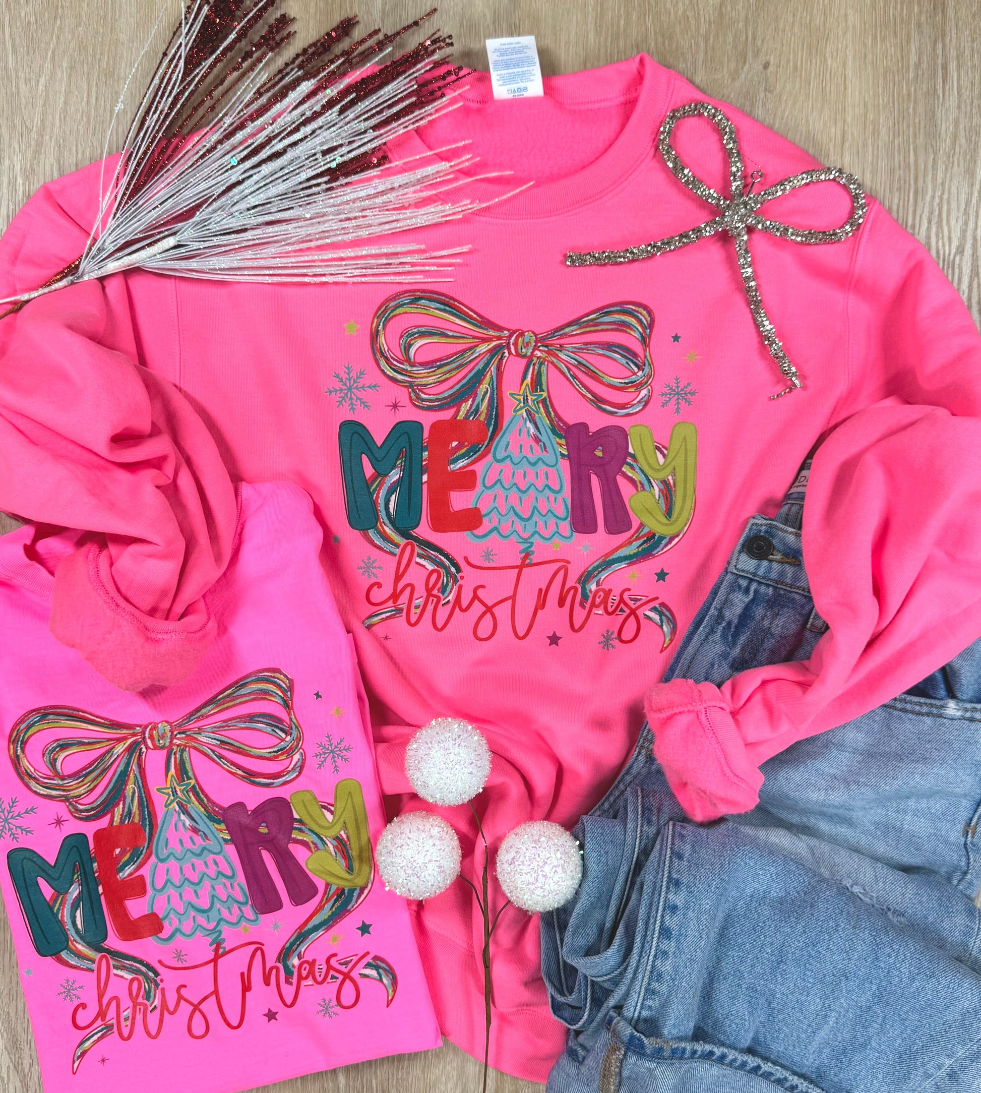 Neon Merry Christmas Tee and Graphic Sweatshirt