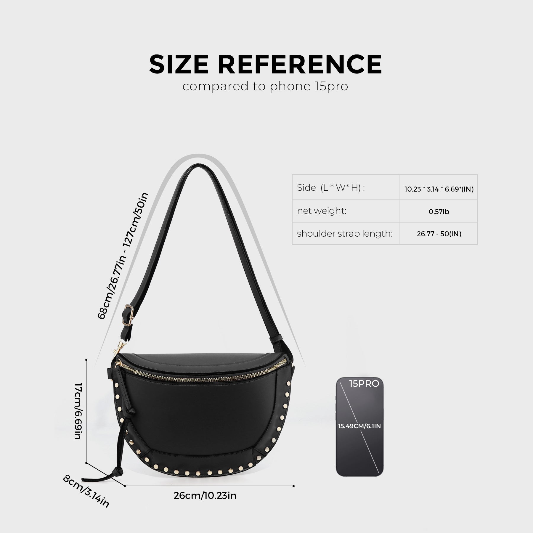 Rock your vibe with this bold vegan leather sling purse that's ready to make a statement. Edgy studs frame the bottom, giving it that perfect touch. Choose from five fabulous colors to match your personality and style. Sling it across your body for hands-free confidence and all-day comfort. Get ready to slay.