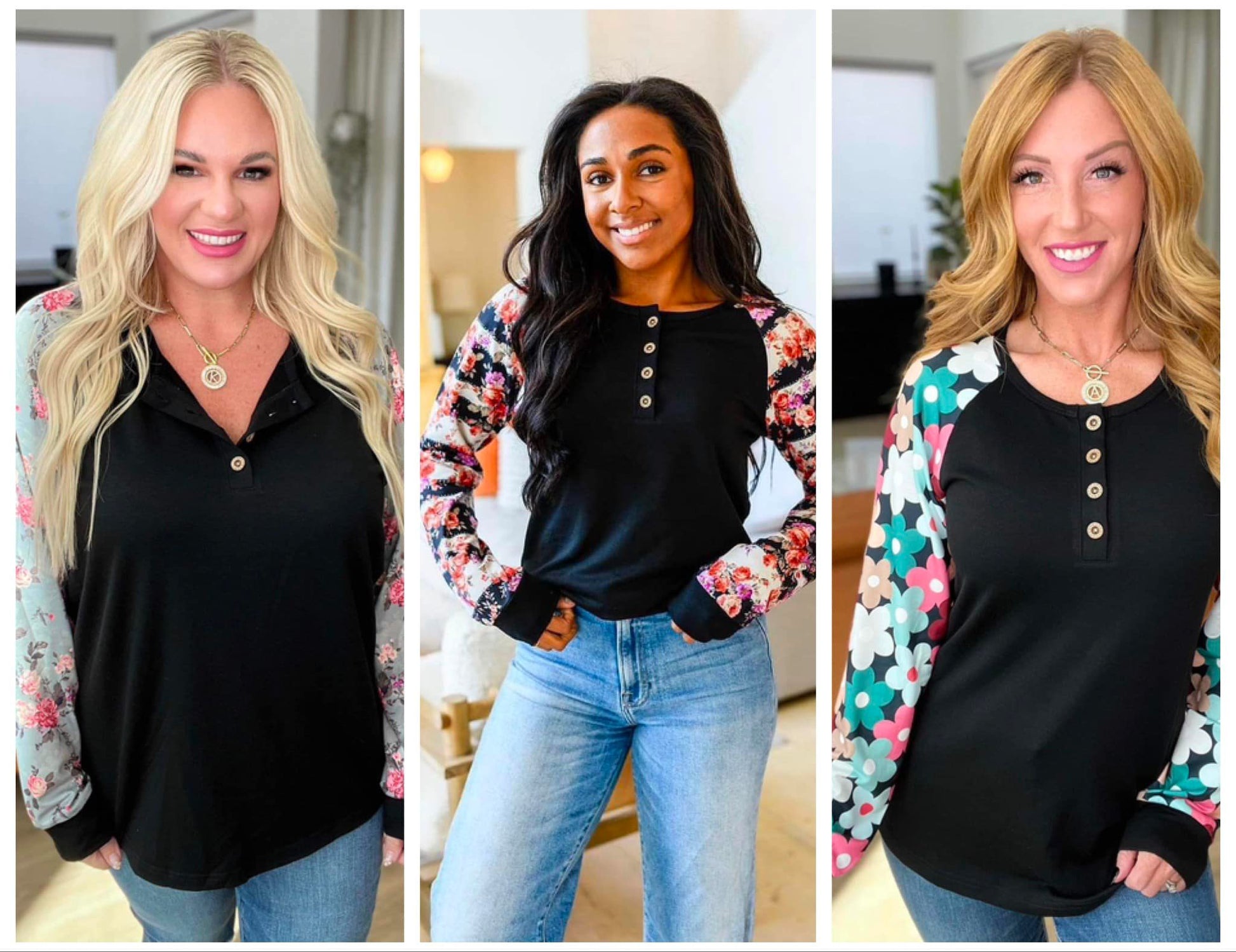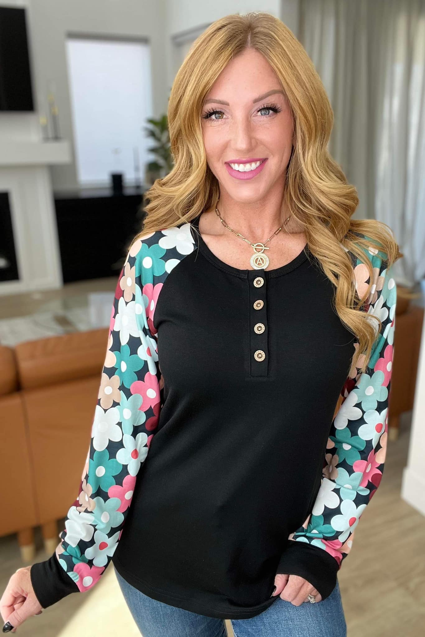 A soft and lightweight french terry raglan with functional buttons and some stretch. We love the contrasting sleeve detail!