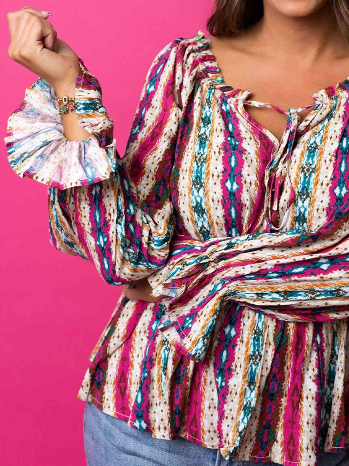 Striped Tie Neck Flounce Sleeve Babydoll Top