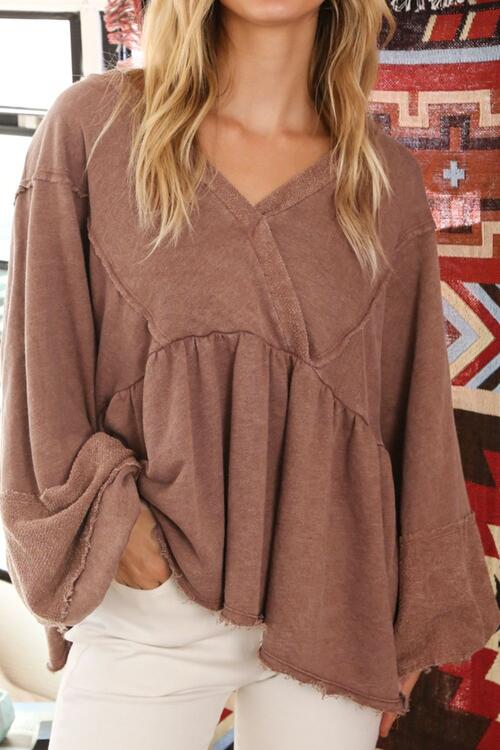 V-Neck Exposed Seams Balloon Sleeve Top