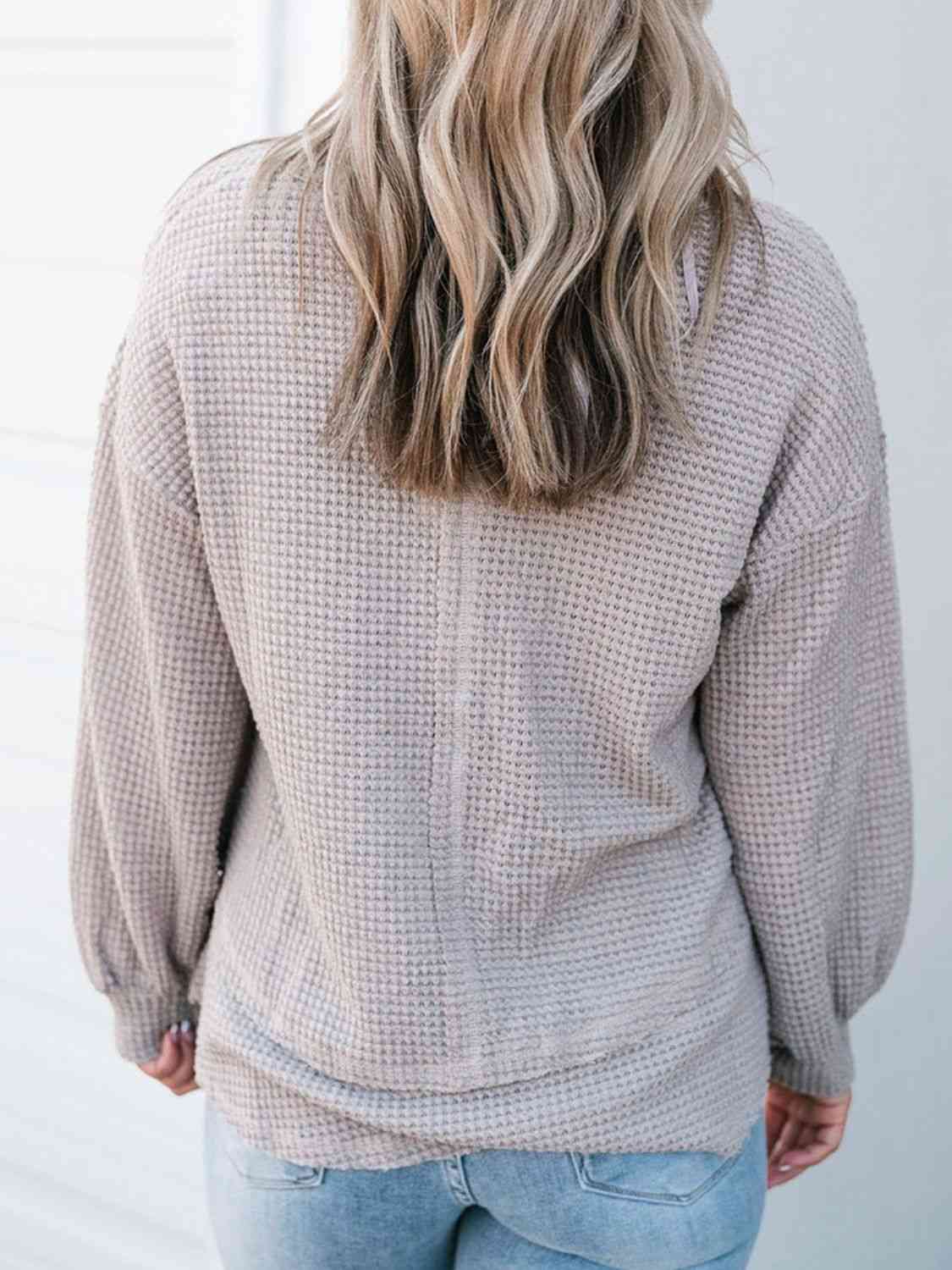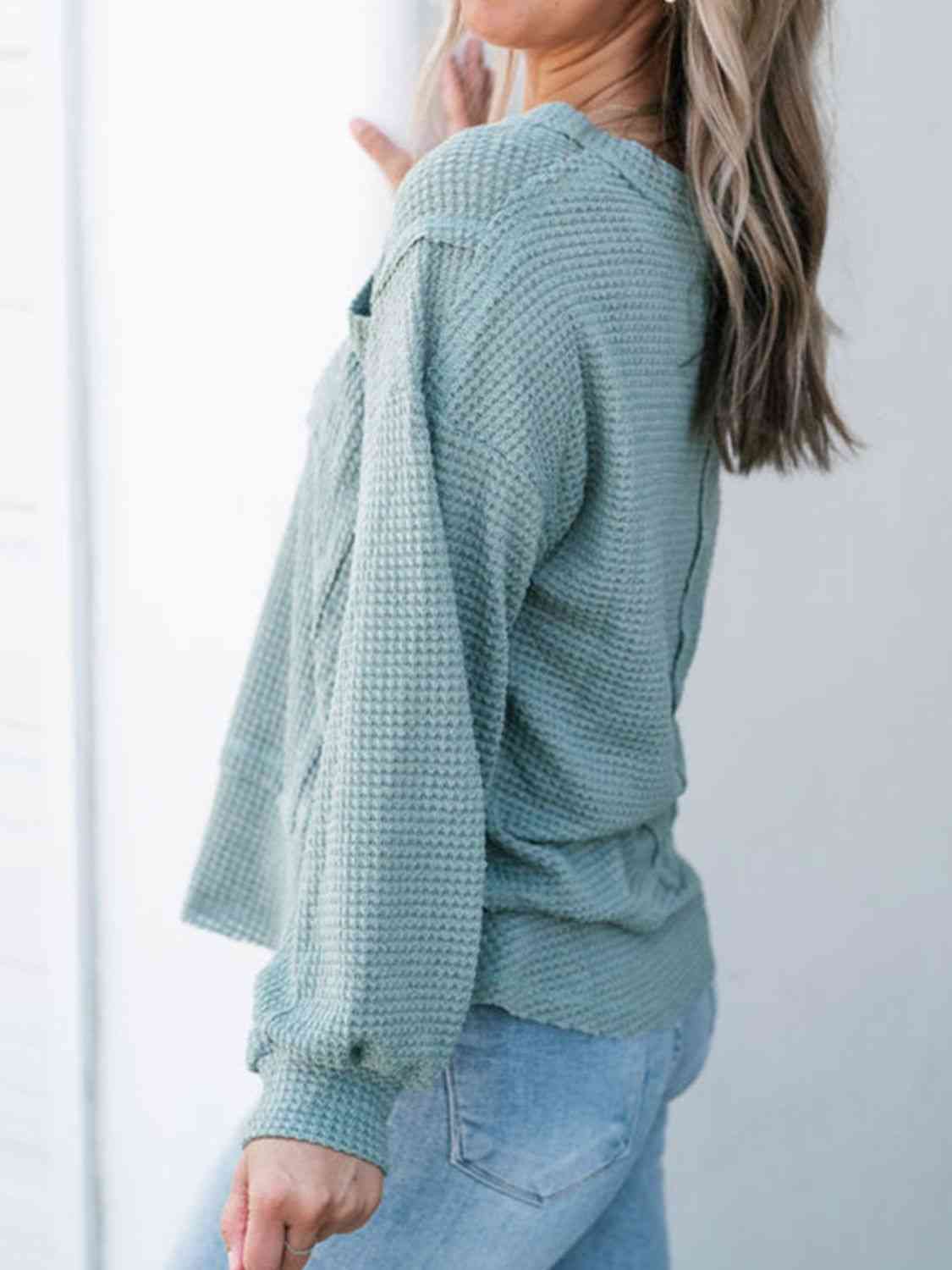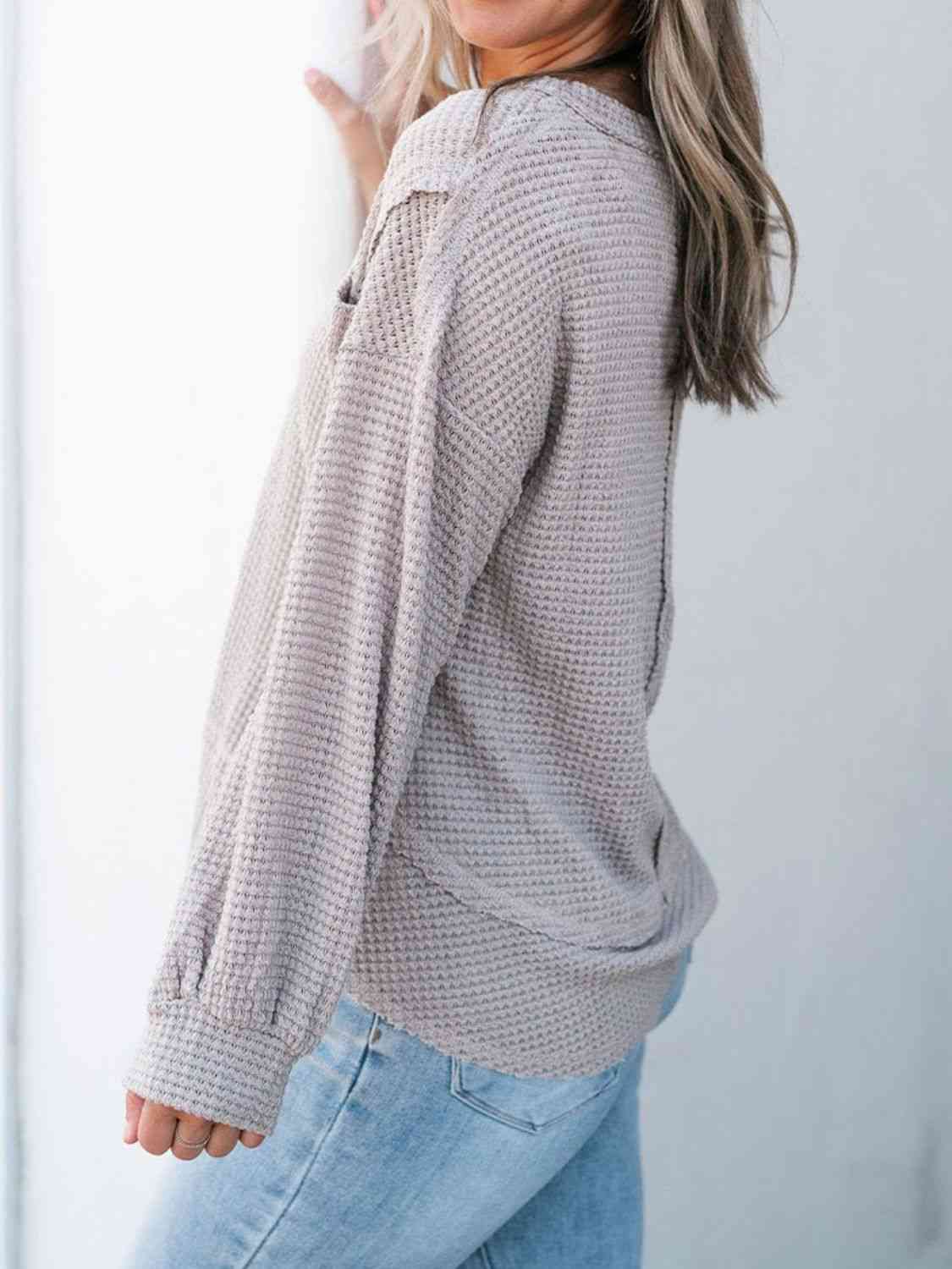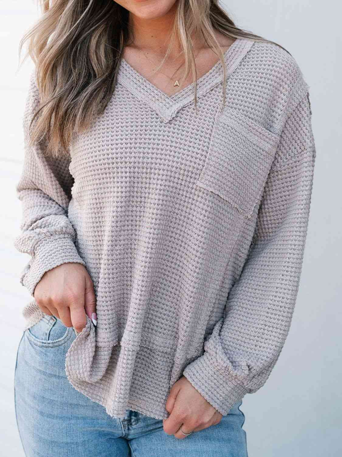 Waffle-Knit V-Neck Blouse with Breast Pocket